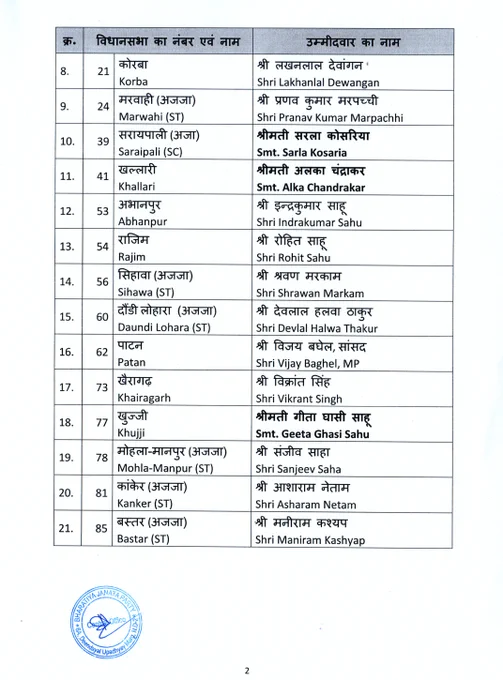 भाजपा ने पाटन से लोकसभा सांसद विजय बघेल, प्रेमनगर से भूलन सिंह मरावी, भटगांव से लक्ष्मी राजवाड़े, प्रतापपुर (एसटी) से शकुंतला सिंह पोर्थे, लुंड्रा (एसटी) से प्रबोज भिंज, सरायपाली (एससी) से सरला कोसरिया, अलका चंद्राकर को मैदान में उतारा है। खल्लारी, राजिम से रोहित साहू, खुज्जी से गीता घासी साहू और बस्तर (एसटी) से मनीराम कश्यप समेत अन्य शामिल हैं।